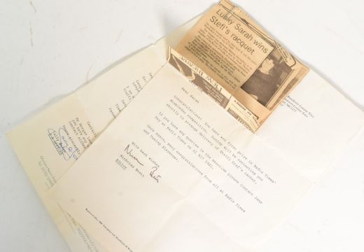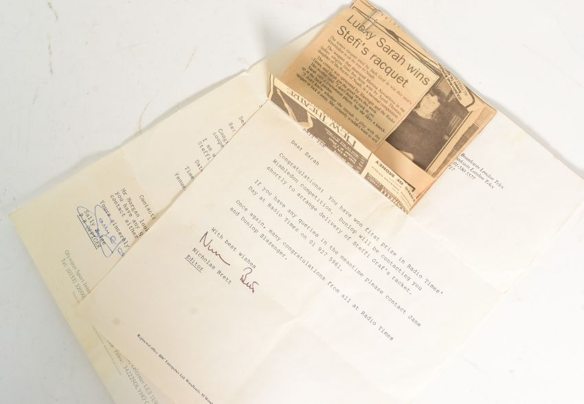 Provenance: the racket was first prize in a Radio Times competition and was won by our client. The original letter from Radio Times is present, along with several newspaper clippings detailing the winner.