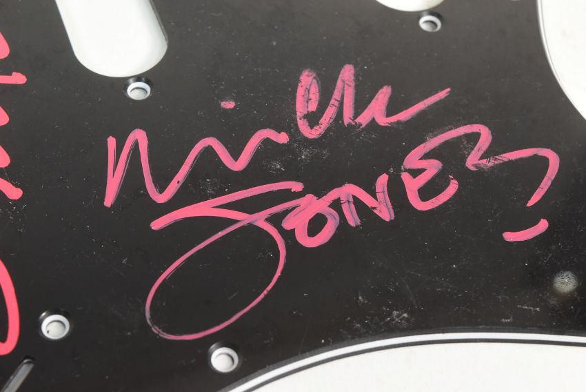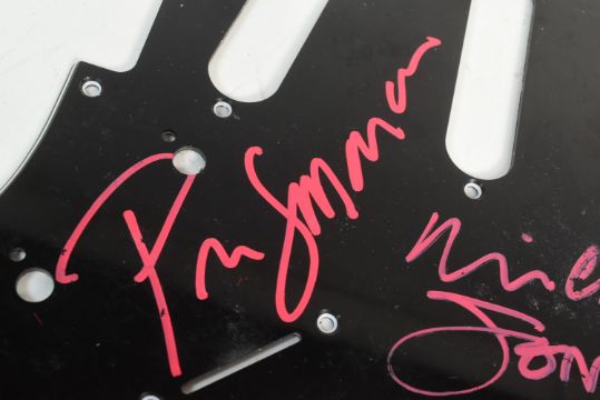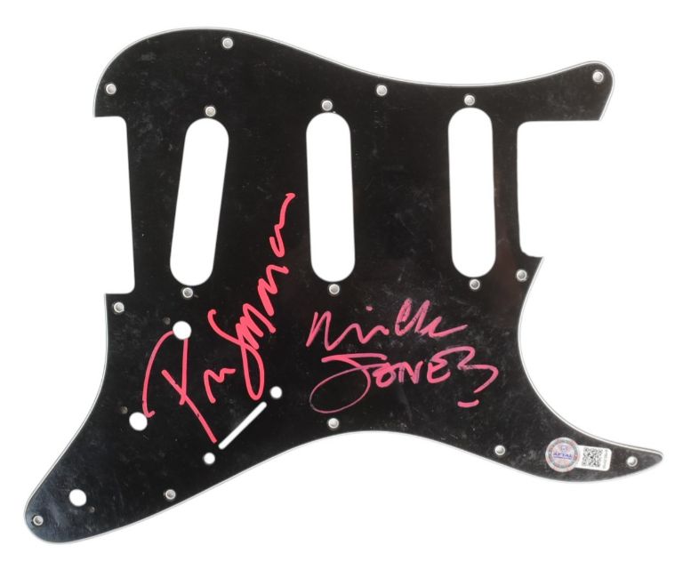 The Clash (English punk rock band) - Mick Jones (guitar) and Paul Simonon (Bass) - dual autographed Stratocaster guitar scratchplate. Both signed in red ink, undedicated. Scratch plate is used. AFTAL authenticated #00v0Z3BoR