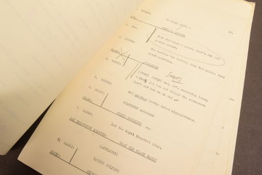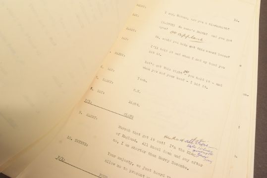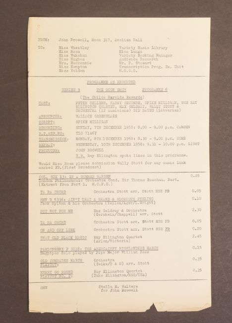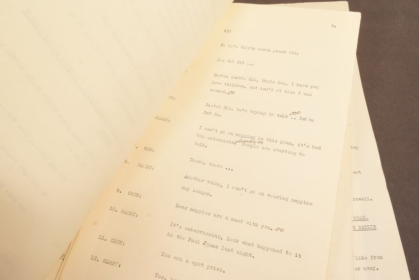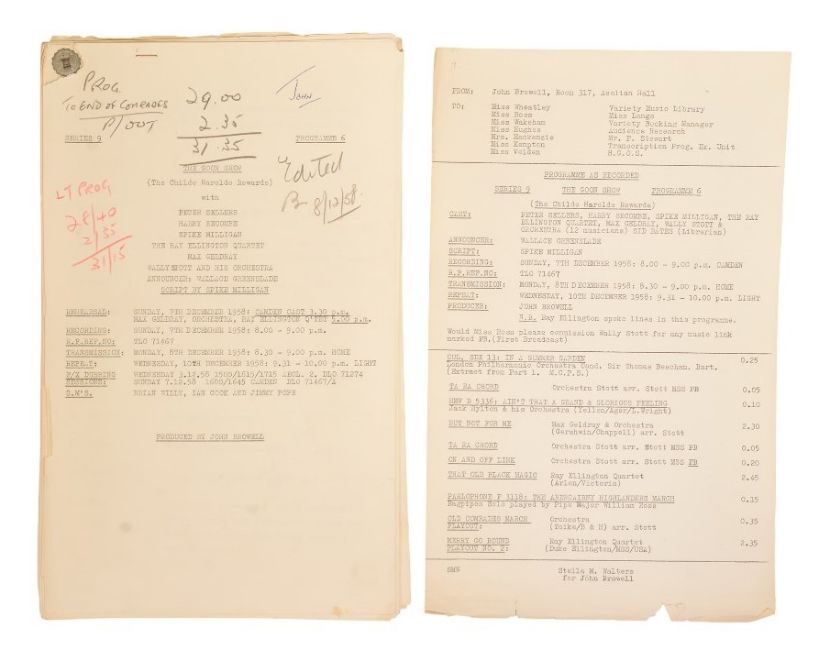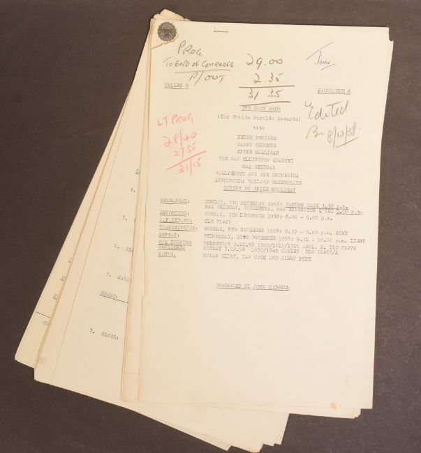 The Goon Show (BBC Radio Comedy Programme 1951-1960 starring Spike Milligan, Harry Secombe and Peter Sellers) – an original recording script owned and used by producer John Browell for Series 9, Programme 6 ‘The Childe Harolde Rewarde’. The script is well annotated throughout in Browell’s hand, with stage directions, altered lines, and general notes taken during recording. His name ‘John’ is noted to the cover page. 26pp, plus cover. With original RX / transmission details sheet. (2)
