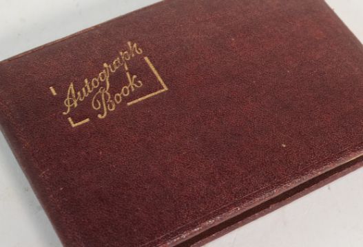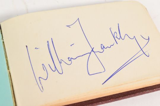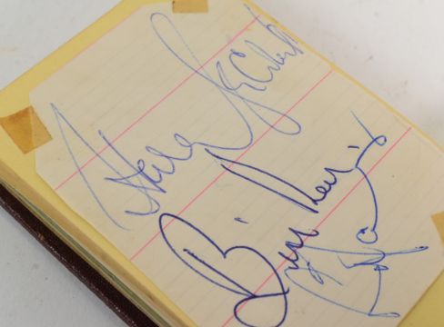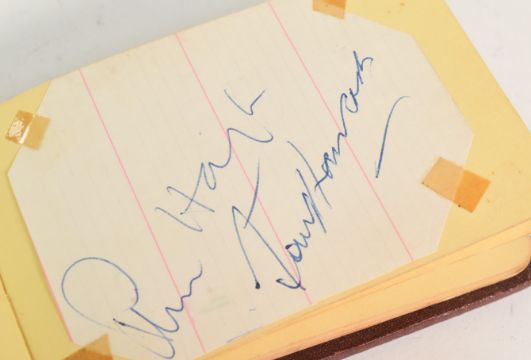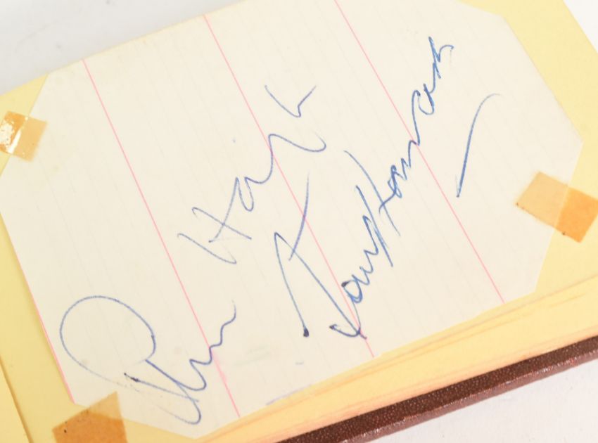 Autograph Album - a c1950s small autograph album containing several signatures from entertainers and actors of the period. Includes: George Cole (loose small signed photo), William Franklyn, Vincent Ball, Spike Milligan, Richard Attenborough, Bernard Lee, Richard Todd, and a few others unidentified. Perhaps of most interest are two laid-in cuttings signed by the cast of 'Hancock's Half Hour' - Tony Hancock, Sid James, Bill Kerr, Harry Secombe, and announcer Peter Haigh. A rare set of autographs to be found together.