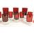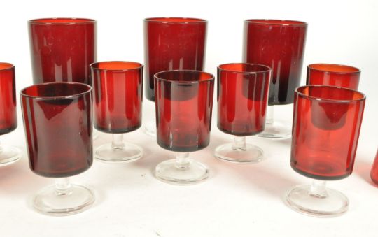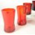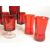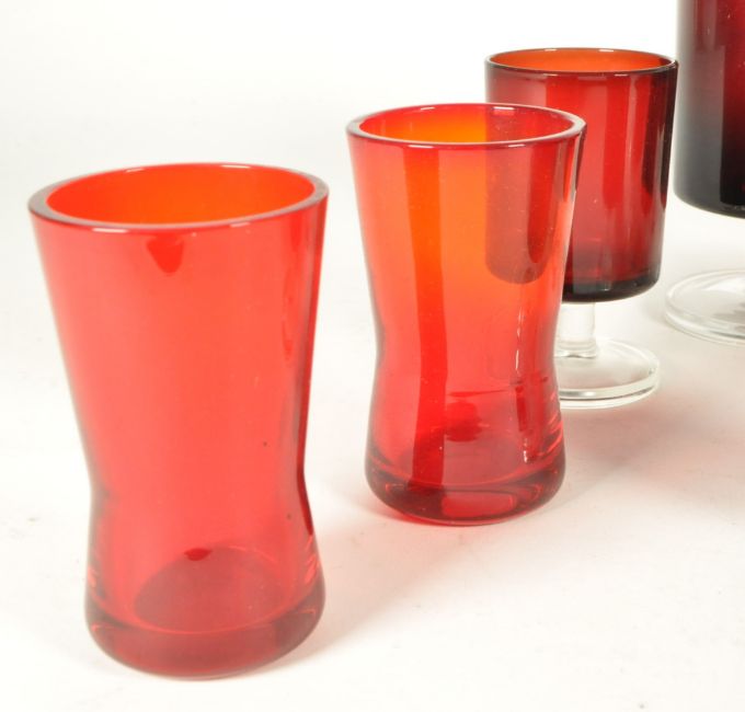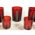 Collection of vintage 1970s French red drinking glasses, including wine glasses, liqueur glasses, and shot glasses. Featuring cylindrical red bodies and clear glass bases. Largest piece measuring approx. 13cm x 7cm.