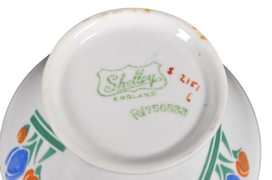 Shelley - An early 20th century circa. 1930s Art Deco Shelley china tea service. The service to include a teapot, milk jug, sugar dish, cup, and two saucers. Having white ground with floral decoration.