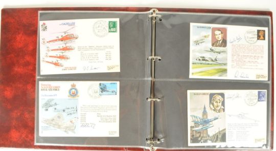 Collection of 1970s Royal Air Force RAF first day covers, all signed. Including examples such as Commemorating the First Flight of the Hawk, Farnborough International 1974, The Launching of HMS Newcastle, and more. Approximately 40 signed RAF first day covers housed within a folder.