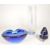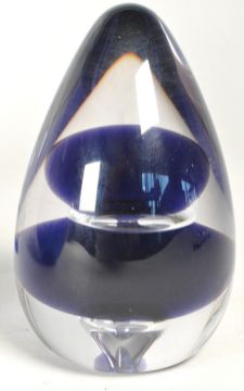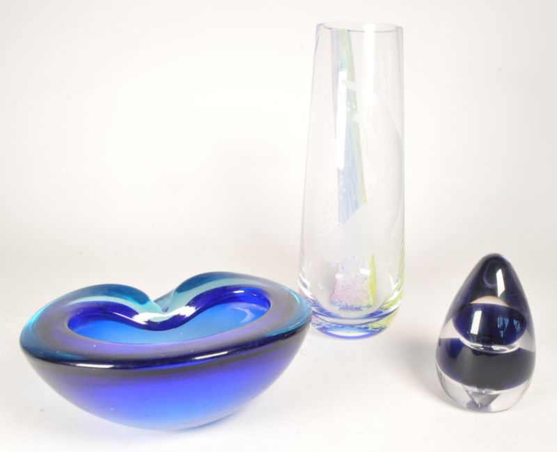Three late 20th century studio art glass pieces. Comprised of a Caithness vase decorated with an etched otter together with a Wedgwood egg shaped paperweight and an unmarked blue squat vase / bowl. Largest measuring approx. 23cm x 7cm.
