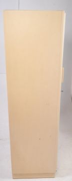 A vintage 20th century Art Deco white kitchen larder pantry cupboard. Panelled front door with painted green design to top, raised on a plinth base with shaped wooden handles. Measures approx: 183x92x56cm