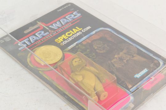 Star Wars - an original vintage 1984 Kenner made Star Wars carded MOC action figure ' Lumat ', from the ' Last 17 ' figures released. Upon its original 92 back The Power Of The Force card, with Collectors Coin. Bubble repaired with tape, but not believed to have been 'opened'. Generally a G to G+ example.