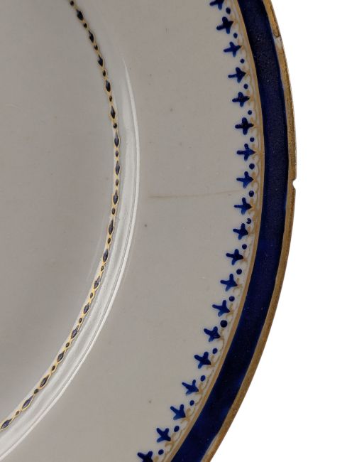 A Chinese export 18th century hand painted porcelain armorial plate. Qing Dynasty, Qianlong period dated 1791. Painted with the arms of Chadwick within blue and gilt borders, the reverse inscribed in black: ‘Canton in China 24th January 1791.