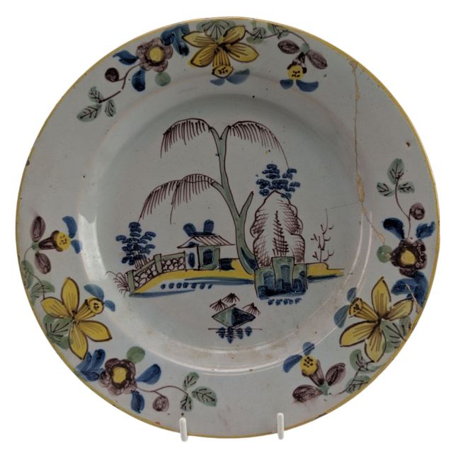 A late 18th century circa 1780 hand painted porcelain London Delftware plate. The plate having a Chinese landscape to centre with daffodils, and other flowers to borders. In blue, green and yellow colourways. Period repair to back with pins.