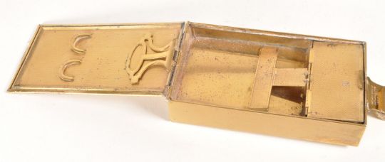 A vintage mid 20th century L.S.M. Parklane combined gold plated cigarette case / powder compact. The compact having hinged locking doors to either side, with lipstick, mirror and hair comb to one side, and cigarette storage to other. Featuring engine turned finish to exterior.