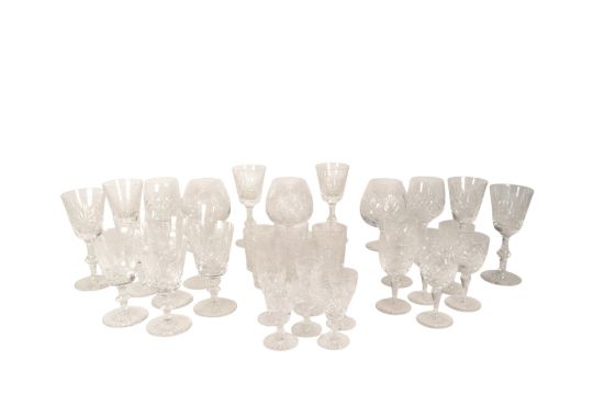 Large collection of 20th century Edinburgh Crystal glasses. Including three brandy balloons, six goblets, six wine glasses, six tumblers and six liqueur glasses. Thomas Webb and Edinburgh Crystal examples included. Makers marks etched to the underside of each piece.