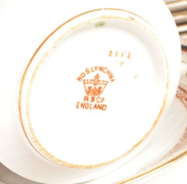 Roslyn china early 20th century twelve person tea service. Comprised of tea cups, saucers, milk jug, saucers, small plates, and serving plate. Decorated in a floral transfer pattern with painted detailing. Makers marks to the undersides.