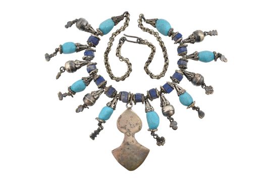 An Ottoman style fringed necklace with central white metal pendant with blue and turquoise-coloured beads and a central pendant. Tests indicate evidence of silver in parts. Total weight 83g. Measures 45cm.