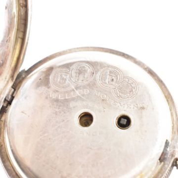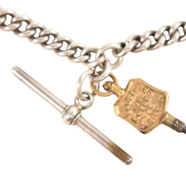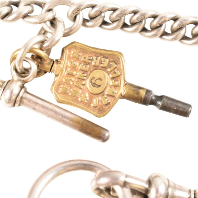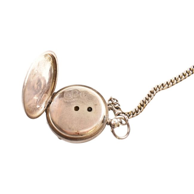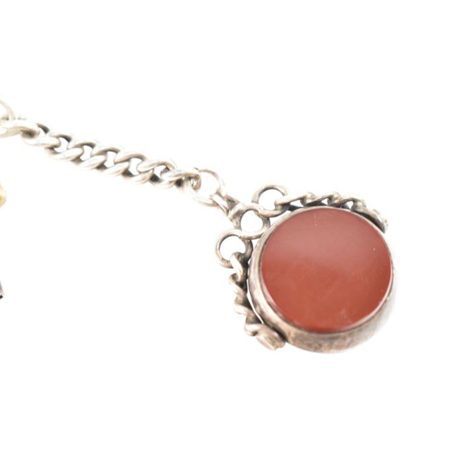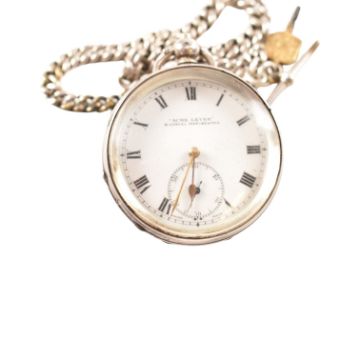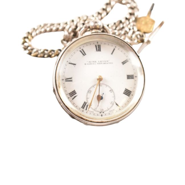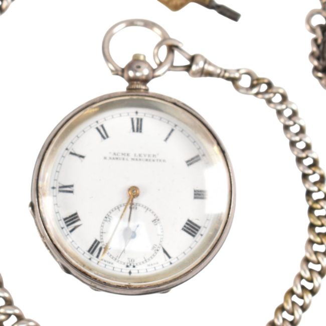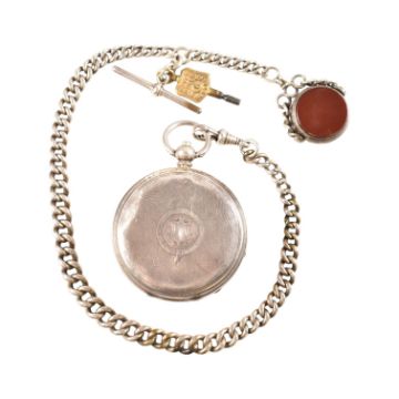 An early 20th century 925 silver pocket watch and albert chain with agate set pendant. The dial marked for H Samuel of Manchester ' Acme Lever ' Weight 154g approx
