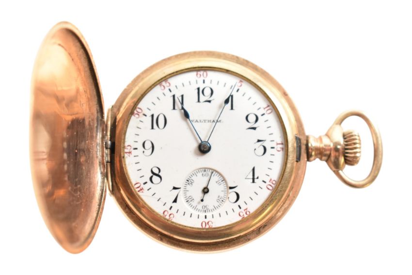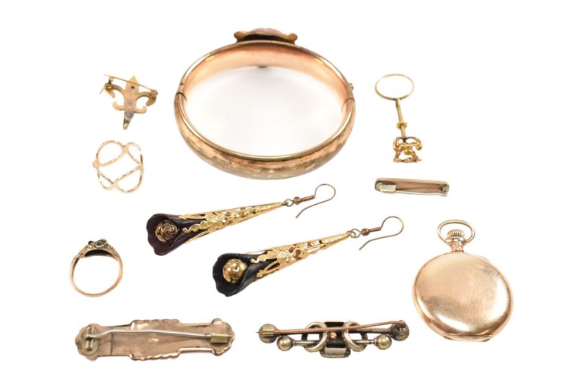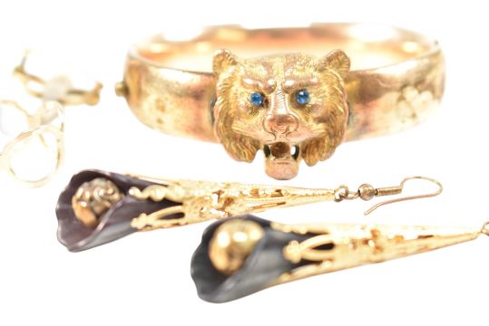 An assortment of 19th and 20th century jewellery to include lion mask bangle, rams head ring. rope twist brooch, enamel set brooch, Waltham hunter pocket watch AF, Darling brooch, 19th century skirt lifter.