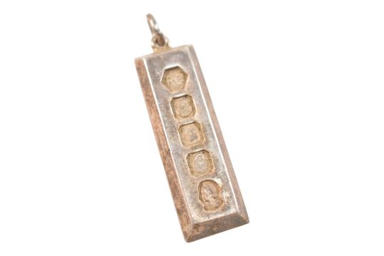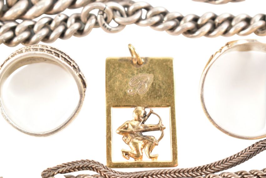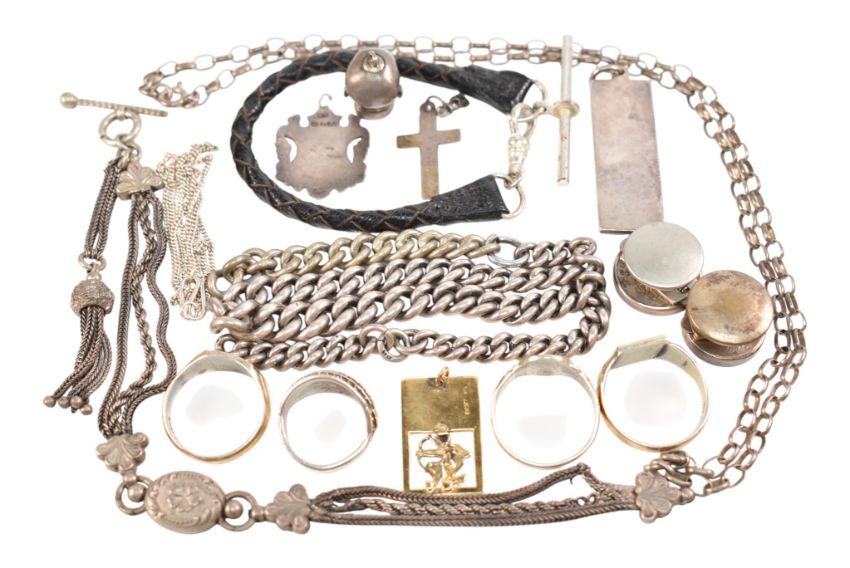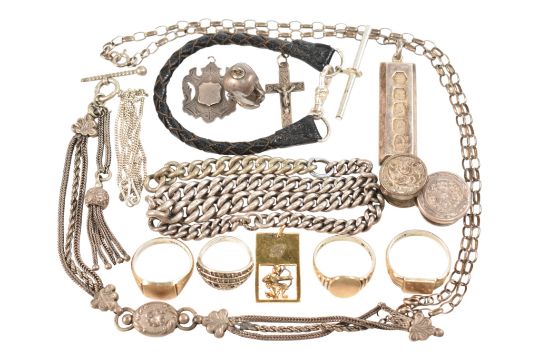 A collection of silver and white metal jewellery. The jewellery to include a 1970s hallmarked silver ingot. A hallmarked silver fob medal. A white metal crucifix. White metal chain. Albertina watch chain. A metal bust of a man pendant marked July 1900 H.W.H Rd 395510, surface tests indicate silver. Three gold on silver signet rings. A part silver watch chain. A hallmarked silver gold plated Sagittarius pendant.