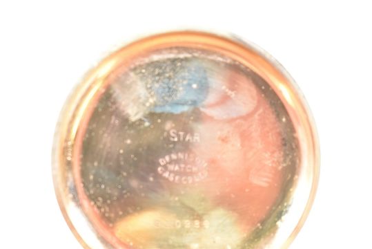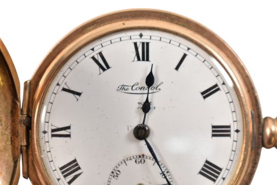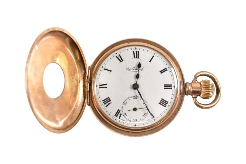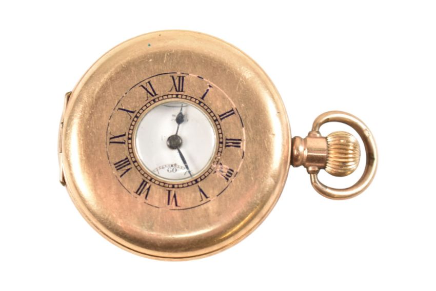 An early 20th century gold plated half hunter pocket watch. Enamel dial with Roman numeral chapter ring. Crown wind with bale atop. The case marked for Denison