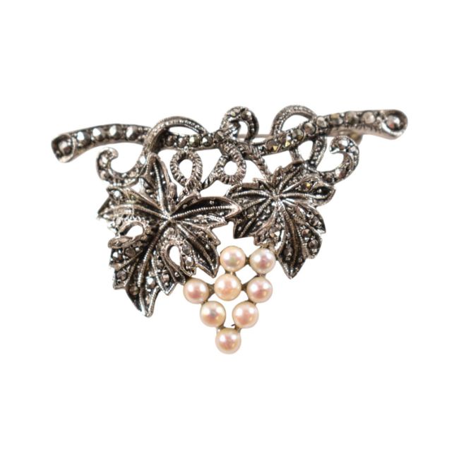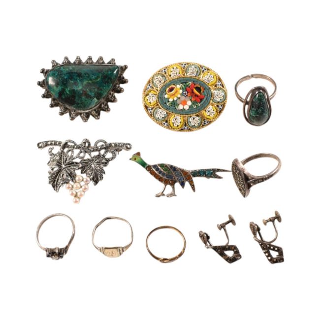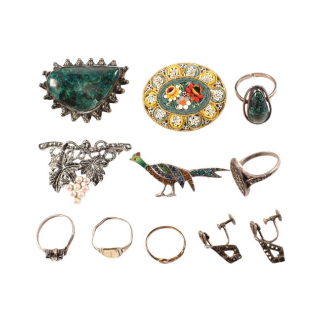 A collection of vintage costume jewellery to include and Israel 935 silver and agate set brooch with matching ring, micro-mosaic brooch on yellow metal,marcasite and cultured pearl brooch, various silver rings and pendant earrings. Total weight 63g