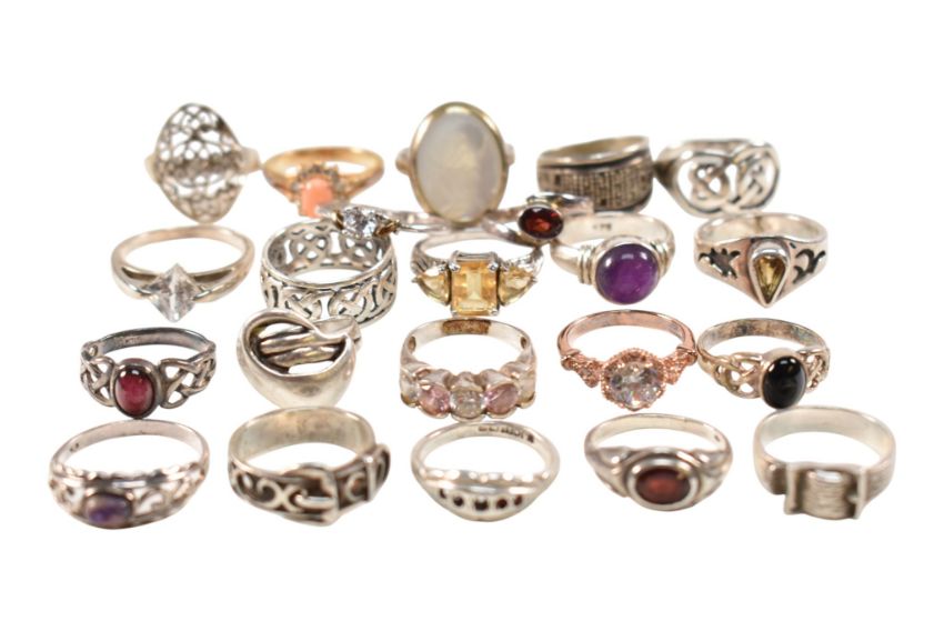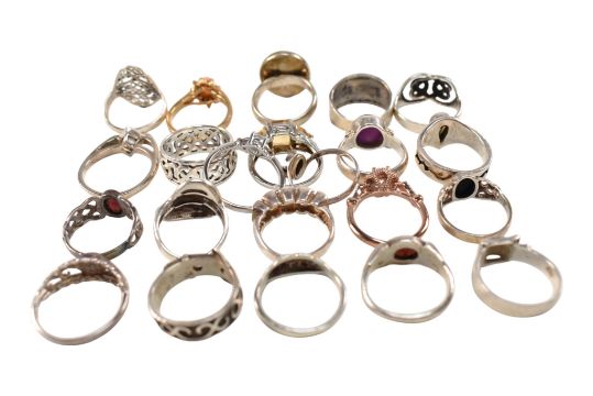 An assortment of silver, white metal and gem set rings. The ring to include a buckle examples a CZ set, garnet, onyx, periced Celtic, Filigree. Most marked 925.
