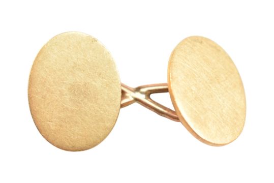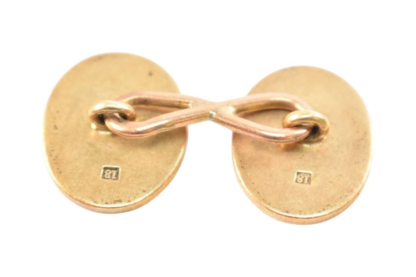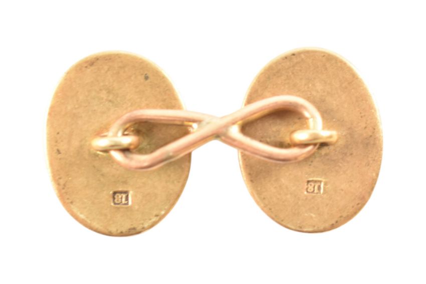 A single 18ct gold cufflink. The cufflink with oval panels united by chain. Stamped 18. Weight 10.6g