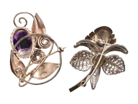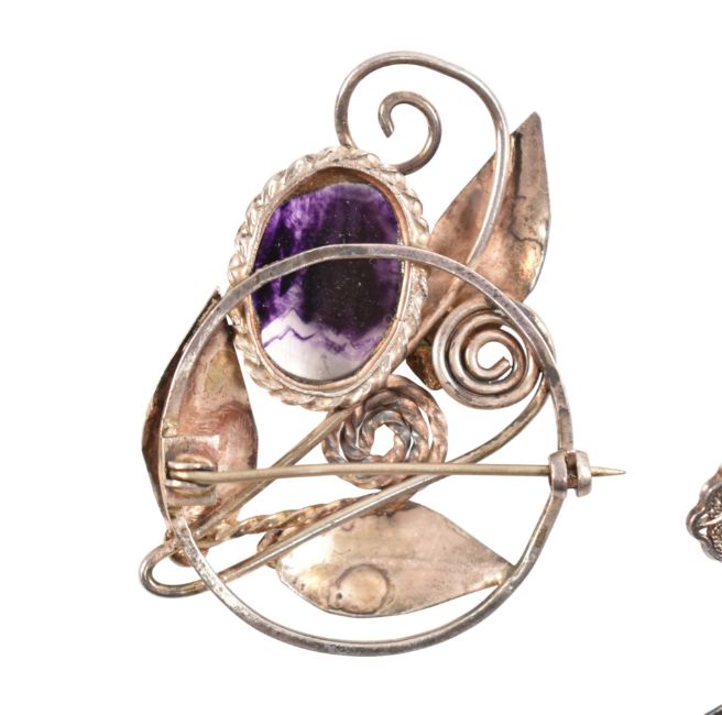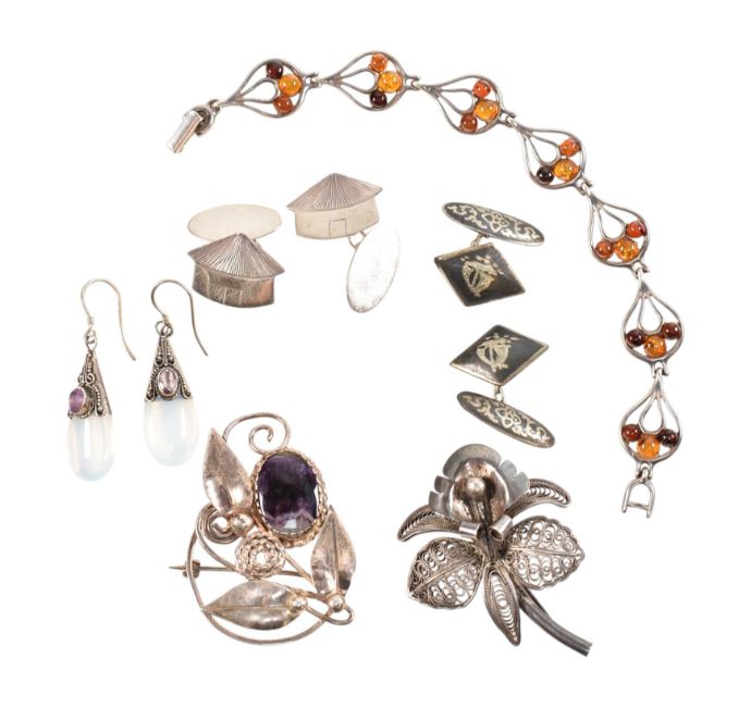 An assortment of silver jewellery. The jewellery to include an Arts and Crafts blue john set white metal brooch pin, a silver and amber bracelet, two pairs of silver cufflinks, a filigree flower brooch a pair of opaline glass and amethyst pendant earrings.