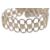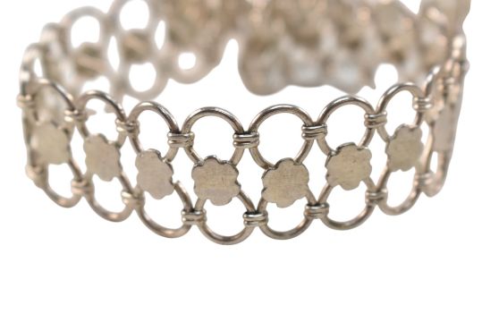A vintage white metal panel belt. The belt is formed with figure of eight panels with a flower motif to an engraved clasp. Unmarked, likely Alpaca. Measures 84cm