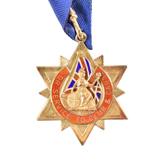 Two Masonic jewels, one hallmarked silver with enamel front having notation ' For Service to Club & Cause.' Together with another yellow metal and enamel set example with ' Five Years ' bars to the ribbon