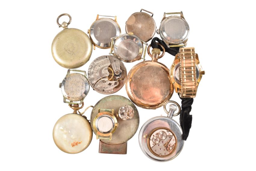 An assortment of wristwatch and pocket watch movements and parts. Including Tissot, Mu Du, Bernex, Poljot, Everite, Waltham, Fear Bristol, Regency.