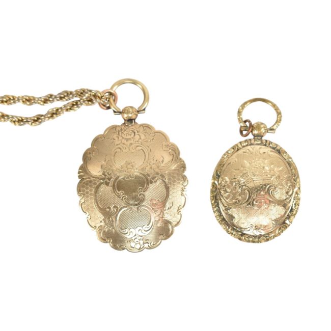 An assortment of jewellery to include gold plated locket pendants, a carved shell cameo three graces brooch pin, a rolled gold bangle, an amethyst, sapphire and pearl pendant necklace with a gilded clasp and beaded links. Total weight 118g.