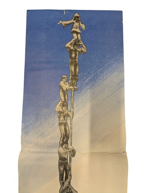 A vintage mid-century circa 1960-1970 Bulgarian acrobat poster advertising the Kehayovi Artists at the Sofia State Circus. Depicting a tower of six acrobats on blue & white round, red and black lettering. Having been folded, some edgewear & folds.
