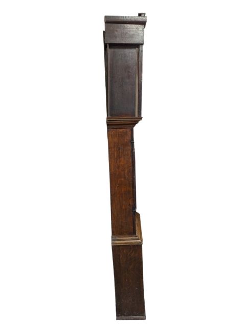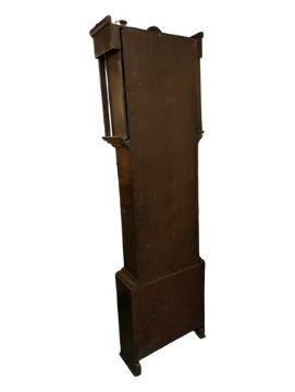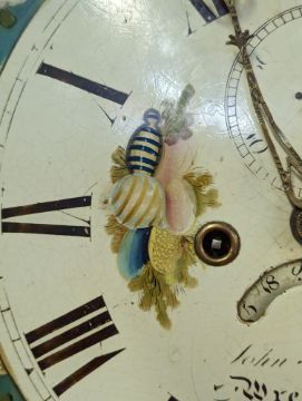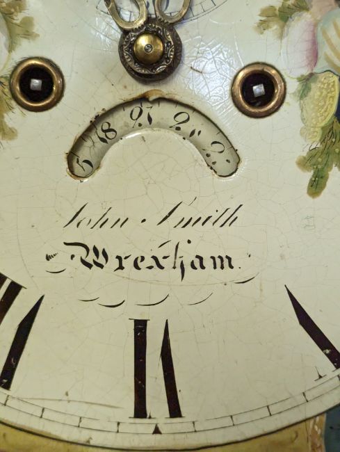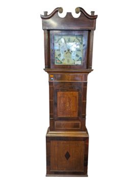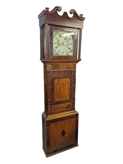 John Smith of Wrexham - A 19th century mahogany & oak inlaid North Country longcase clock. Featuring a carved scrolled swan neck pediment atop a squared hood flanked by corinthian style columns. Painted clock face surrounded by floral hand painted decorations in a yellow, pink and blue colourway, with a black Roman numeral chapter ring. The case having an inlaid seashell decoration to the centre surrounded by inlaid geometric borders. Raised on a plinth style base. Measures approx: 210x57x22cm