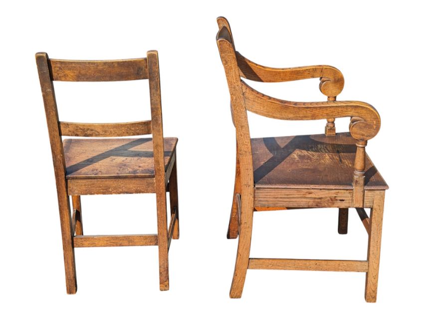 A set of six 19th century Victorian Welsh oak farmhouse bar back dining chairs. Comprised of two carvers with rolled armrests and four standard examples. Measures approx: 93x53x53cm