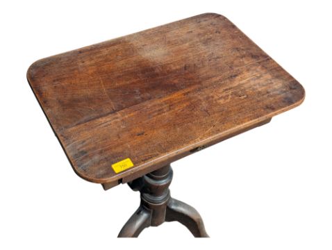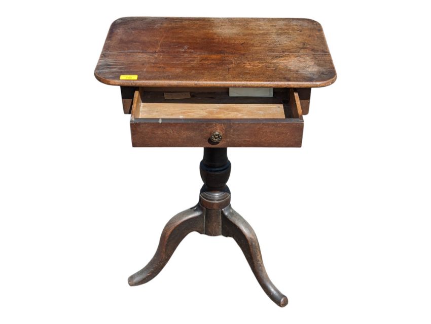 19th century Victorian mahogany pedestal table with drawer. Features a rectangular table top with rounded edges over a single drawer raised on a turned base with three splayed cabriole legs. Measures approx: 72x56x39cm