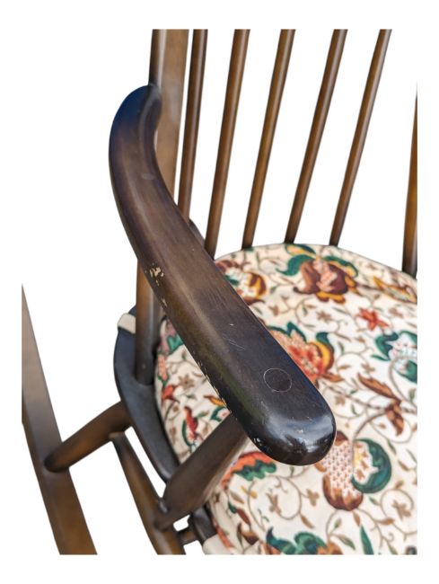 Ercol - Lucien Ercolani - Model 428. A retro vintage mid 20th century Windsor rocking chair having a hooped backrest, shaped elbow rests, saddle seat raised on curved rockers. Measures approx: 83x62x70cm