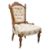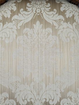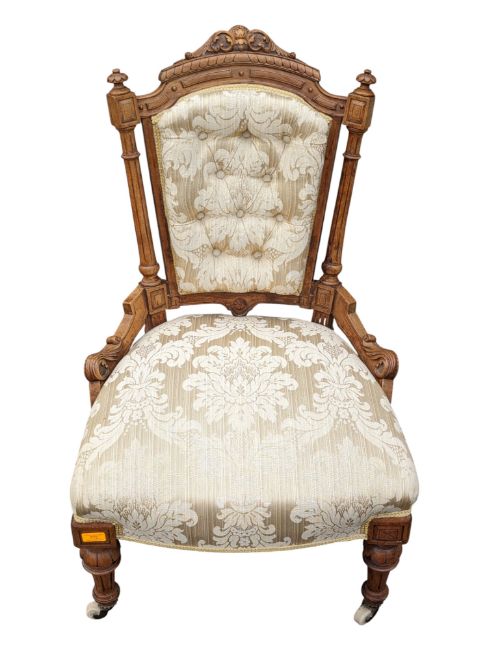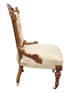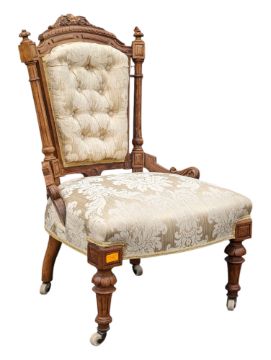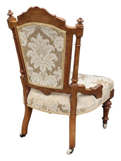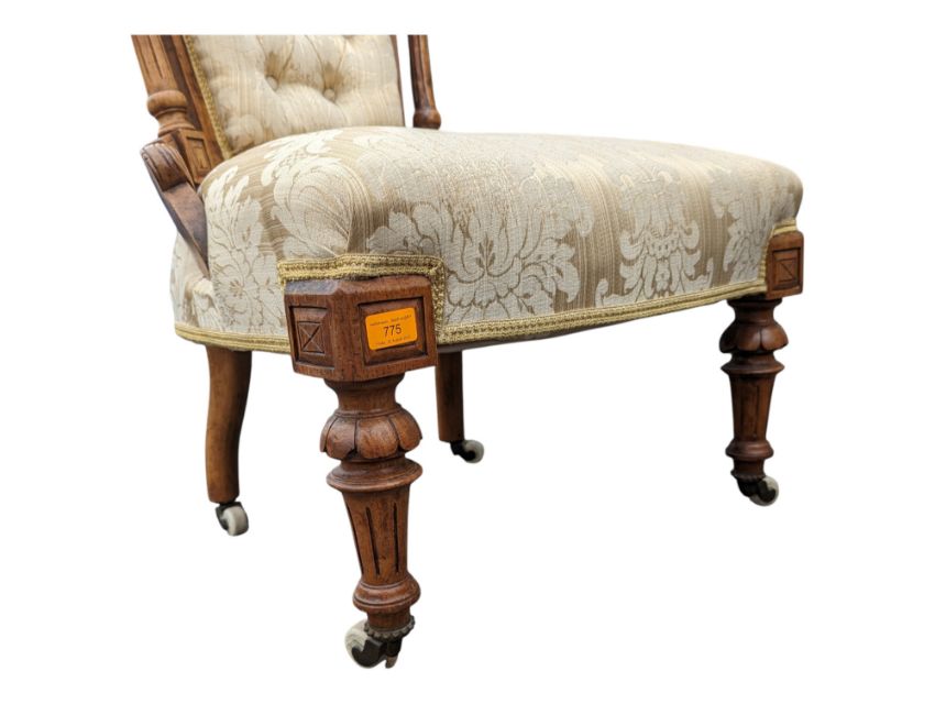 A Victorian 19th century walnut bedroom / salon chair. Having carved acanthus leaf detail to top above button back padded back rest, in damask upholstery. Overstuffed cushioned seat on reeded tapering legs finished with ceramic white castors. Measures approx: 91x59x52cm