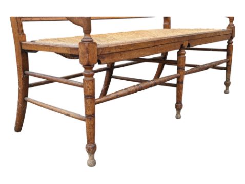 Late 19th century Victorian Arts & Crafts oak hall settle bench and chairs. The bench and chairs being raised on turned legs with shaped elbow rests and slatted back rests. Together with matching dining chairs and carver armchairs. Measures approx: 90x127x59cm