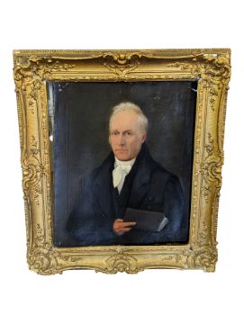 A Victorian 19th century oil on canvas portrait painting study. The study of a gentleman holding a book. In larger giltwood frame. A/F. Measures approx: 102x89cm