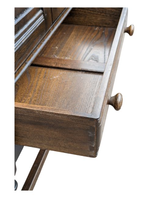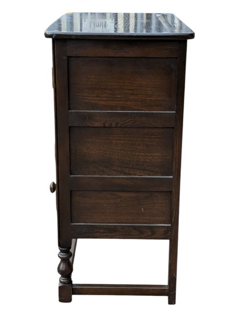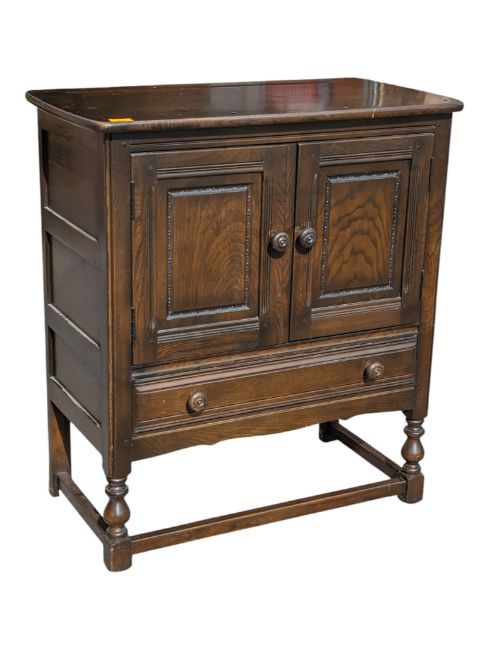 Ercol Furniture - A mid 20th century Ercol old colonial credence cupboard. The cupboard having two panelled doors to the front opening to reveal a spacious interior with a shallow shelf, over a drawer. Raised on turned supports united by stretchers. Measures approx: 89x80x44cm