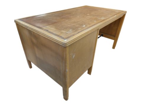 Air Ministry mid 20th century style beech wood and inset topped desk. The desk with a series of drawers flanking the open kneehole. Chrome pull handles. Together with a desk cahir and single chair Measuring approx. 76cm x 153cm x 85cm.