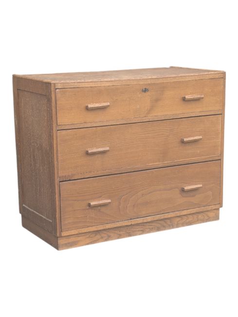 A Mid century Air Ministry style oak chest of drawers. The chest featuring three drawers, each with two rectangular pull out handles. Keyhole to top drawer. Measures approx: 75x91x46cm