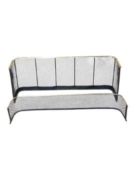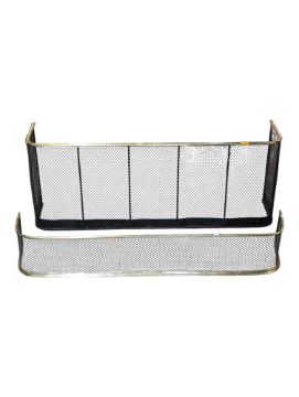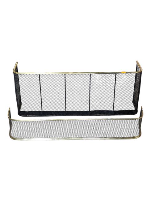 A 19th century Victorian mesh club style fire fender together with another mesh fender kerb example. Metal brass construction with ebonised panels. Together with a smaller kerb example. Measures approx: 47x123x30cm
