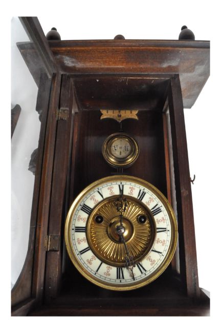 19th century Victorian Vienna Regulator pendulum cased wall clock. White enamel clock face with Roman numeral chapter ring and brass mounts inside a glazed case flanked by a turned and carved wooden frame. Carved and turned finials atop and below the clock's main body. Measuring approx. 74cm x 31cm x 17cm.