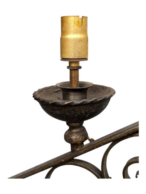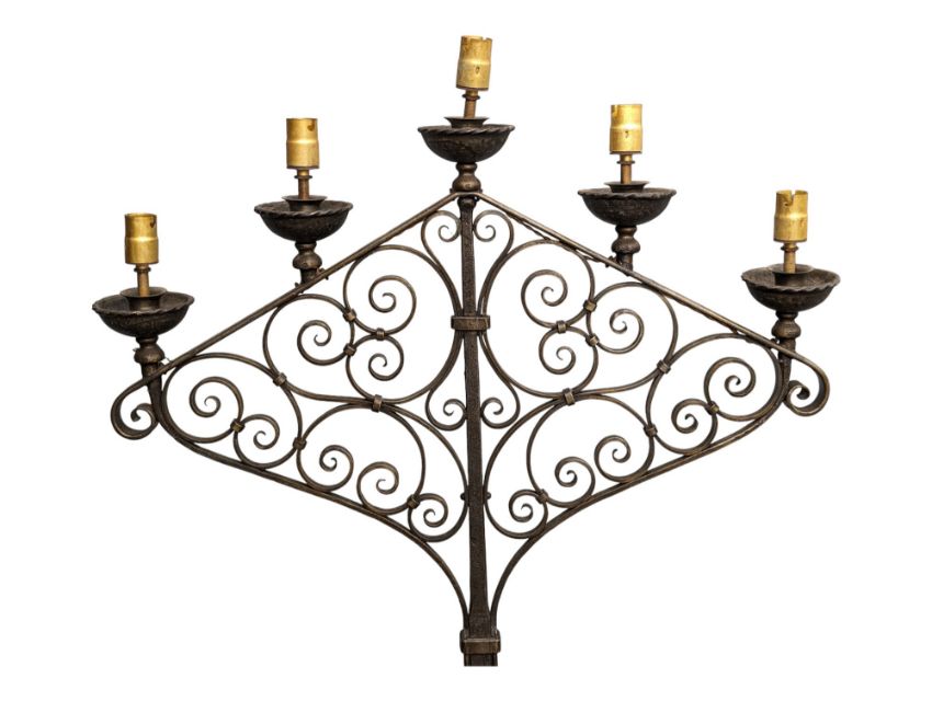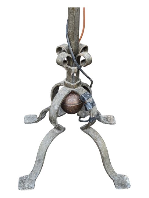 A 20th century wrought iron floor standing lamp light candelabra. The lamp of upright Gothic form with yellow shades atop. All raised on a scrolled wrought iron worked base. Measures approx: 161x59cm