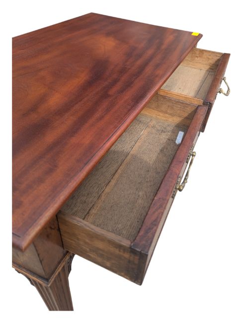 A late Victorian 19th century Chinese Chippendale manner mahogany side table / writing desk. Featuring a rectangular top over two drawers to the frieze with brass drop swing handles. Raised on carved tapering squared legs and ornate pierced corner arches. Measures approx: 70x90x47cm