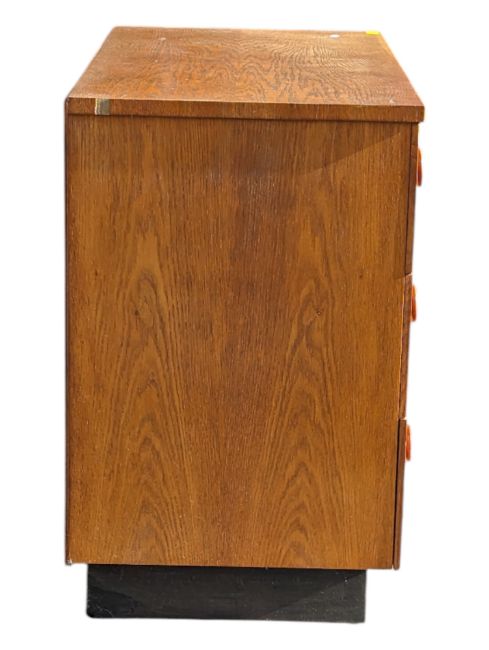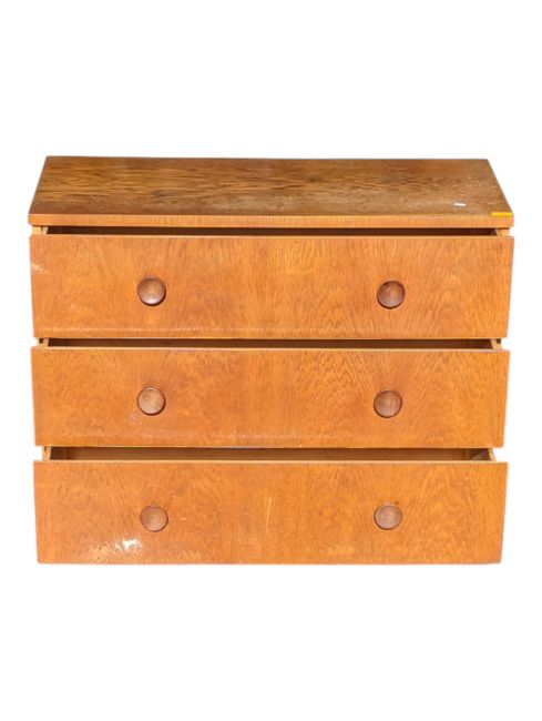A 1930s Art Deco manner ash and maple wood pedestal chest of drawers. Featuring a rectangular body over three drawers each with two round handles. All raised on a black inset plinth base. Measures approx: 75x93x46cm