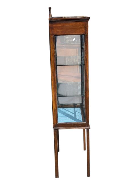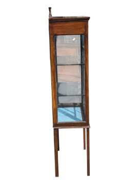 Edwardian mahogany line inlaid china display cabinet vitrine. Featuring glazed sides and front opening door with two glass shelves within. Upstand / galleried back to top and raised on narrow square section legs. Key present and lock operational. Measures approx: 146x59x33cm