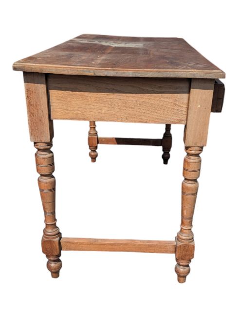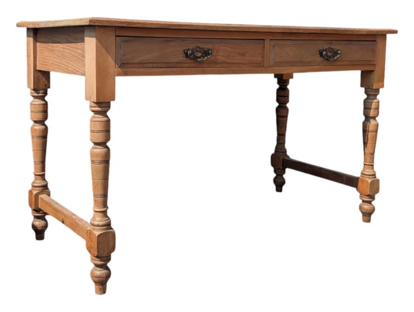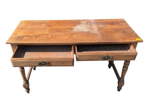 A late 19th century Arts & Crafts Edwardian mahogany writing table. Features a rectangular table top over two drawers and raised on four turned legs. Each leg pair is joined by a stretcher. Drawers with brass drop swing handles. Measures approx: 72x123x55cm