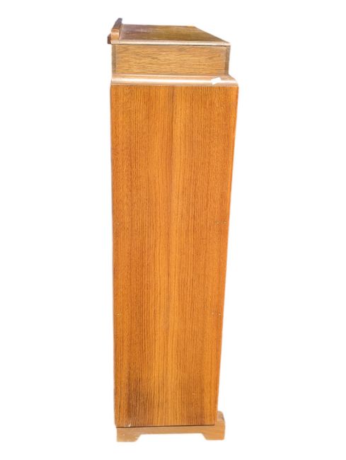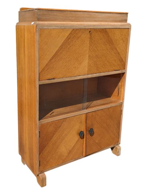 An early 20th century 1930s Art Deco oak student bureau desk cabinet. Featuring a rectangular top with short gallery back over a fall front bureau, a glazed cupboard and two twin cupboard doors. Cupboard doors with floral decorated knob pull handles. Measures approx: 111x76x28cm