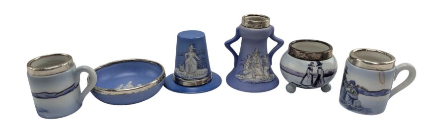 A collection of fifteen 20th century Welsh ladies' hand-painted silver rimmed ceramic trinkets and vases. To include bud vases, miniature mugs & loving cups, a shaker, etc. All with hallmarked silver rims, on blue ground with white painted country scenes.