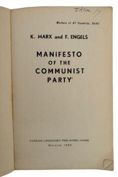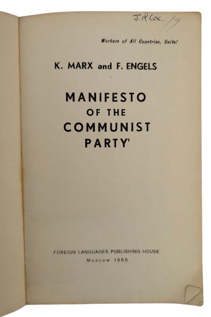 Philosophy and Politics: - Marx, K. & Engels, F. 1959. Manifesto of the Communist Party. Moscow: Foreign Languages Publishing House. A scarce edition of Karl Marx and Friedrich Engels political pamphlet discussing their thoughts on communism and captalism. Publisher's original paper wraps. Slight chipping to backstrip, light creasing to wraps and a few pencil marks from a previous owner throughout. Ink inscription to title page. 8vo. (1)