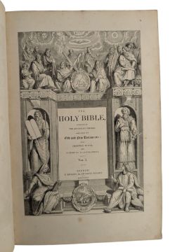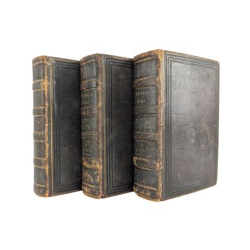Knight, Charles. 1837 The Pictorial Bible; being the Old and New Testaments according to the Authorized Version; illustrated with Many Hundred Woodcuts. London: Charles Knight & Co. Full morocco binding, gilt bands & titles to spine, extremities rubbed and bumped, head and tail of the spine and joints also rather rubbed, marks, dents and scratches to boards, all edges gilt, front hinges a little strained, internally a little age-toned else smart. 4to. (3vol)